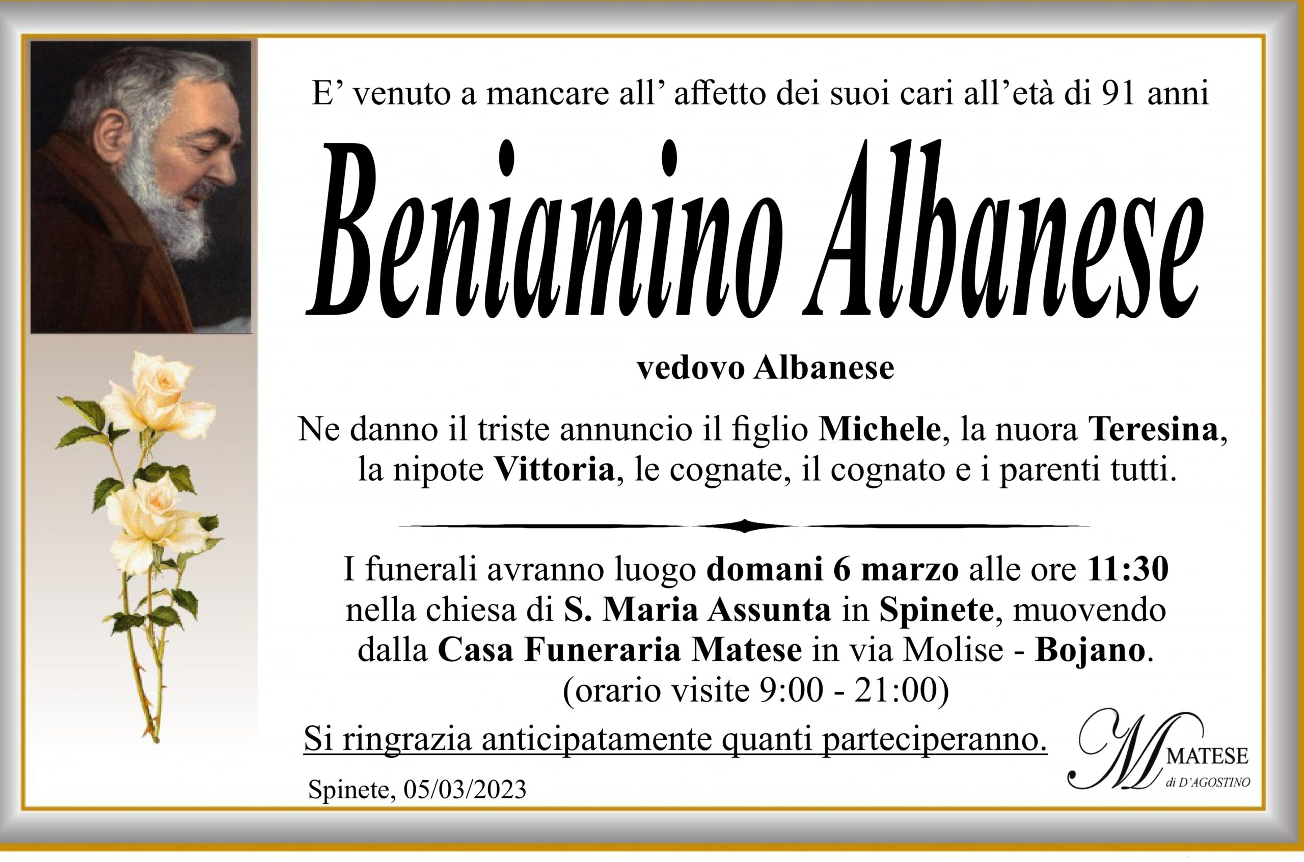 I funerali avranno luogo domani 6 marzo alle ore 11.30 nella chiesa di S. Maria Assunta in Spinete, muovendo dalla Casa Funeraria Matese in Bojano, Via Molise.