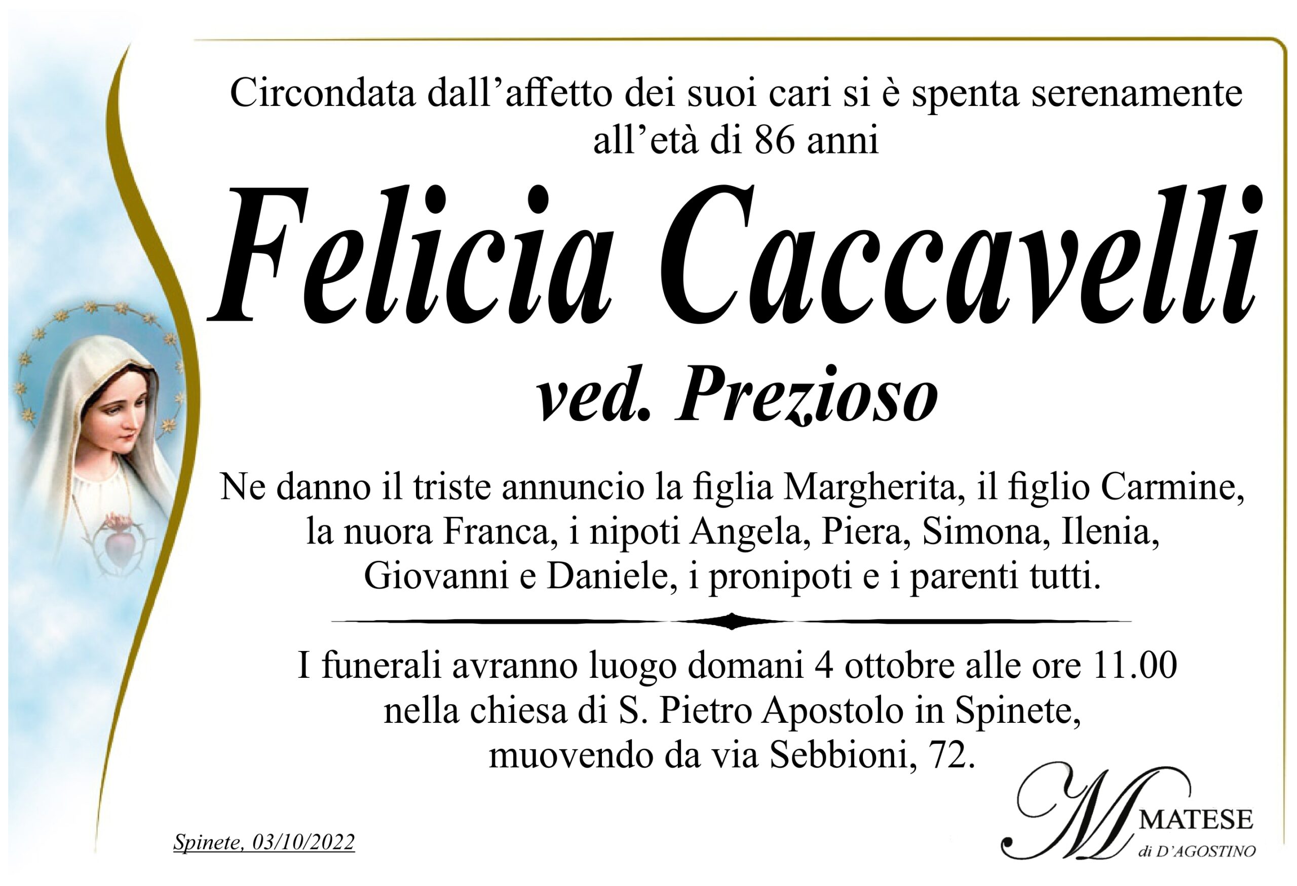 Ne danno il triste annuncio la figlia Margherita, il figlio Carmine, la nuora Franca, i nipoti Angela, Piera, Simona, Ilenia, Giovanni e Daniele, i pronipoti e i parenti tutti.