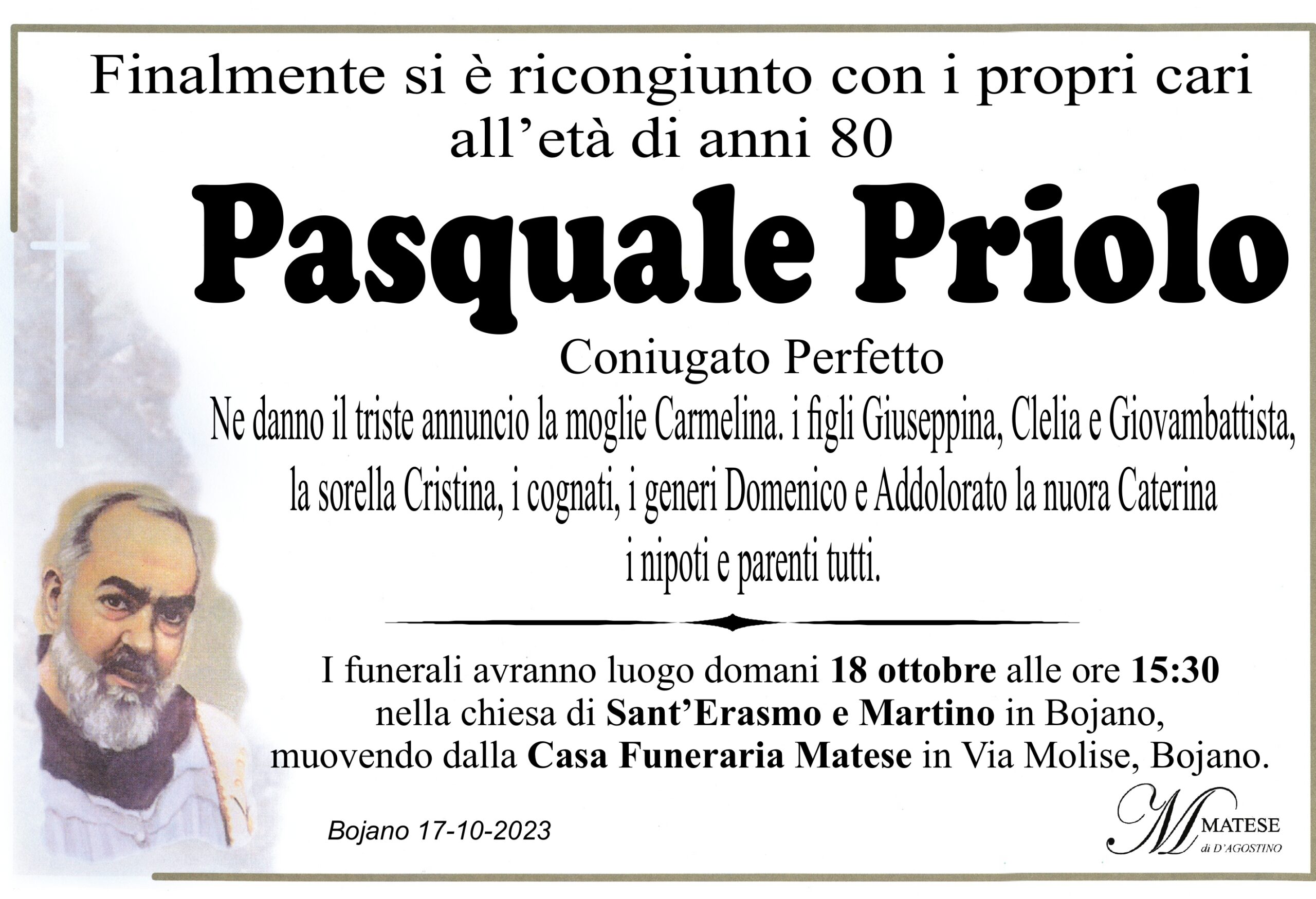 I funerali avranno luogo domani 18 ottobre alle ore 15.30 nella chiesa di S. Erasmo e Martino in Bojano, muovendo dalla Casa Funeraria Matese in Via Molise.