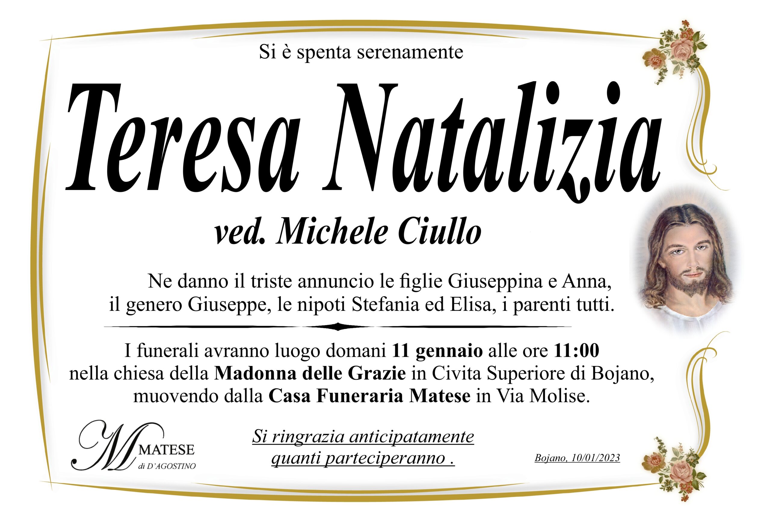 I funerali avranno luogo domani 11 gennaio alle ore 11.00 nella chiesa della Madonna dele Grazie in Civita Superiore di Bojano,